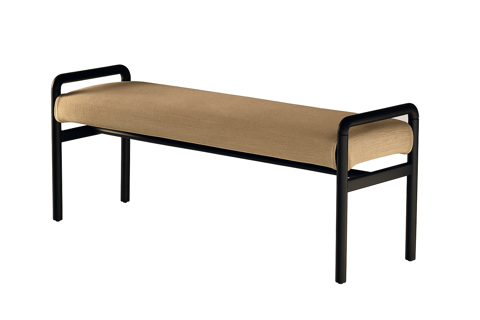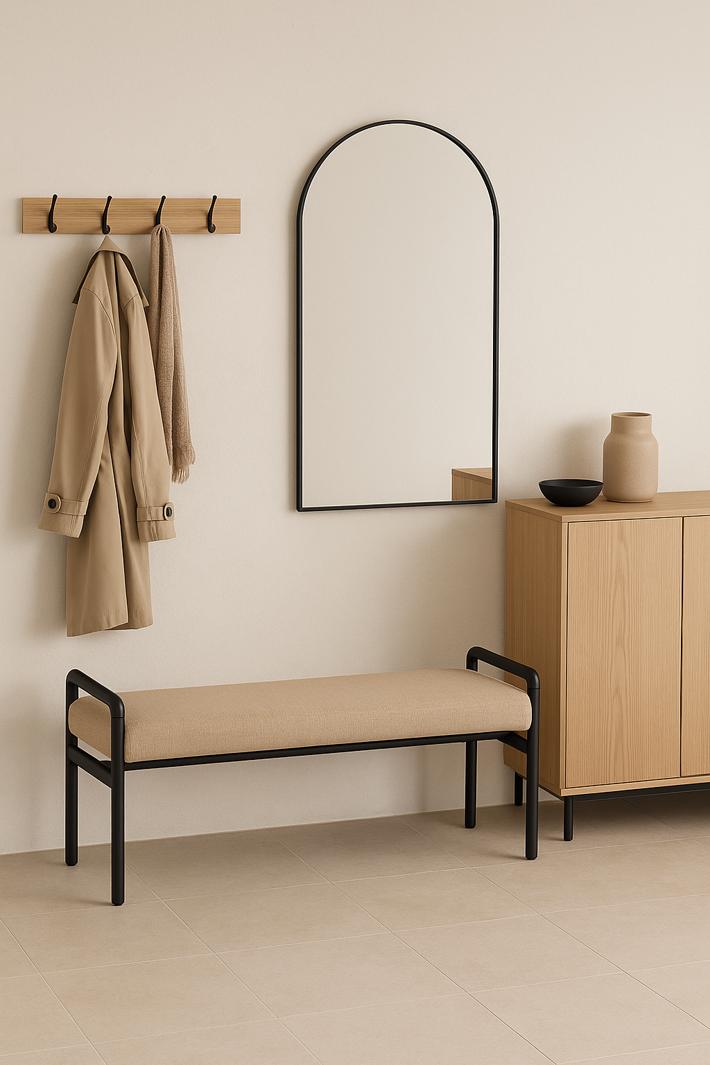 El banco Elda irradia una elegancia silenciosa que se adapta con naturalidad a cualquier espacio. Su estructura metálica en negro mate dibuja una silueta moderna y equilibrada, mientras que el asiento tapizado en tejido color arena aporta una nota cálida y acogedora. Es la pieza ideal para un recibidor sobrio, un dormitorio con aire nórdico o un pasillo que busque carácter sin exceso.
