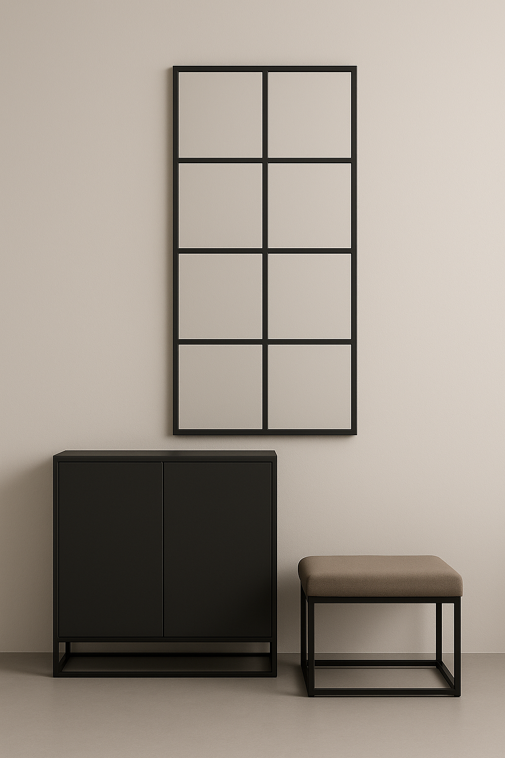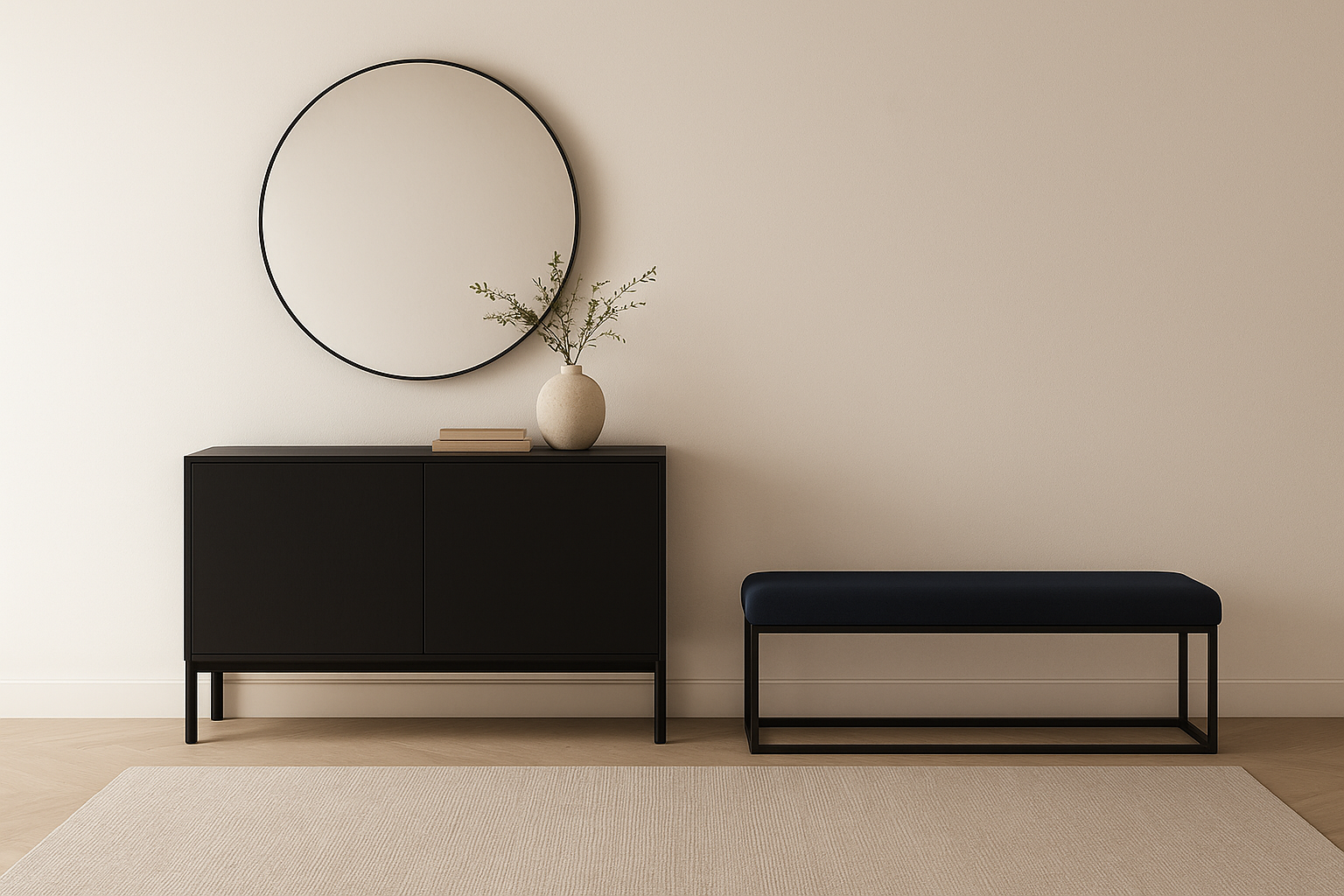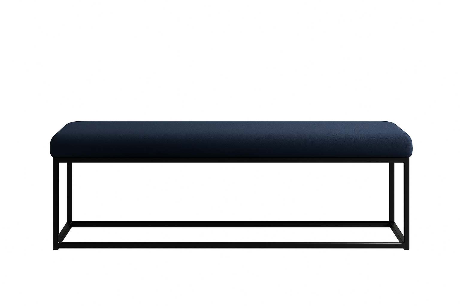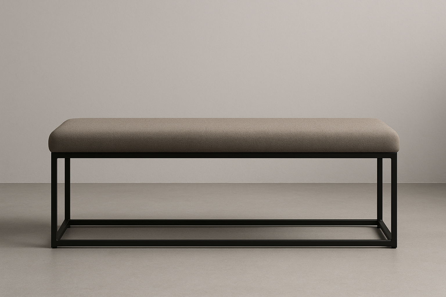 El banco Olivia combina la calidez del textil con la elegancia sobria del metal. Su tapizado en azul marino, sereno y envolvente, aporta una nota de profundidad que se integra con facilidad en dormitorios luminosos o entradas de carácter contemporáneo. La estructura de acero negro sostiene con discreción el asiento, dando forma a una pieza funcional que transmite calma y orden.