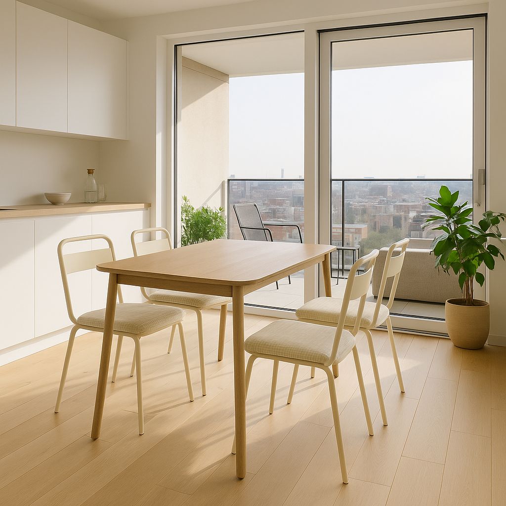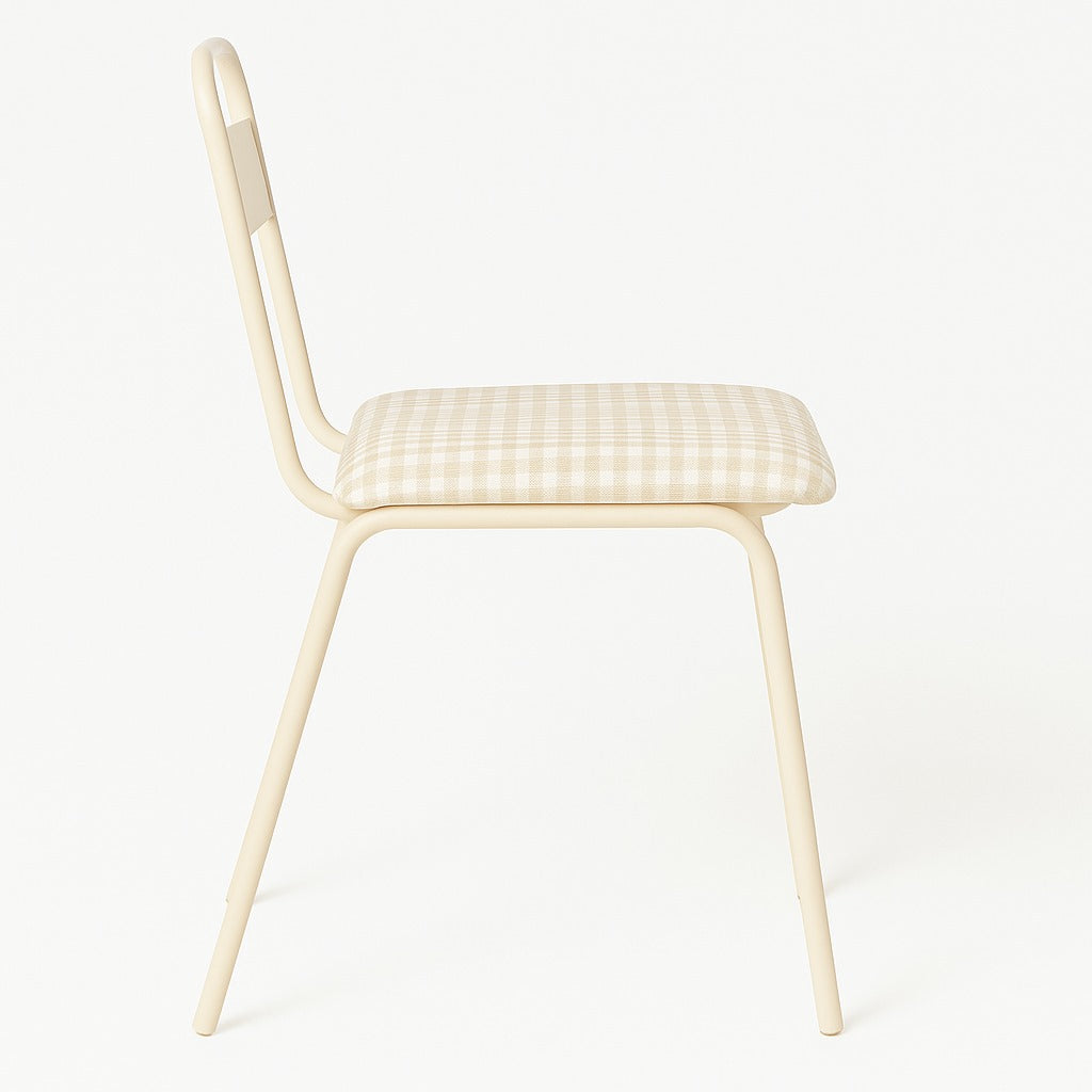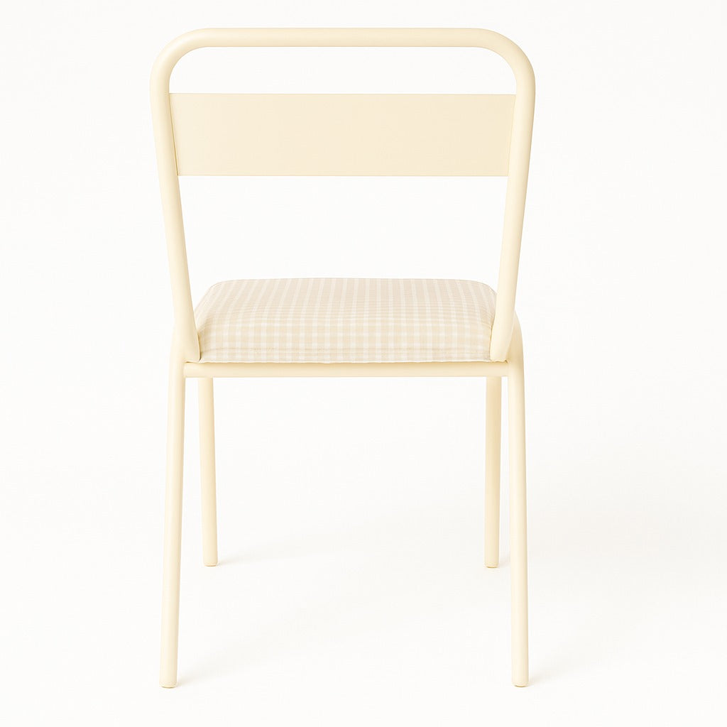 La Silla Alba nace de la luz suave de la mañana. Su diseño combina una estructura metálica en tono marfil con un asiento tapizado en cuadros finos que evocan la calma de los hogares mediterráneos. Ligera, cómoda y discreta, Alba aporta equilibrio a cualquier espacio: cocina, comedor o rincón de lectura.