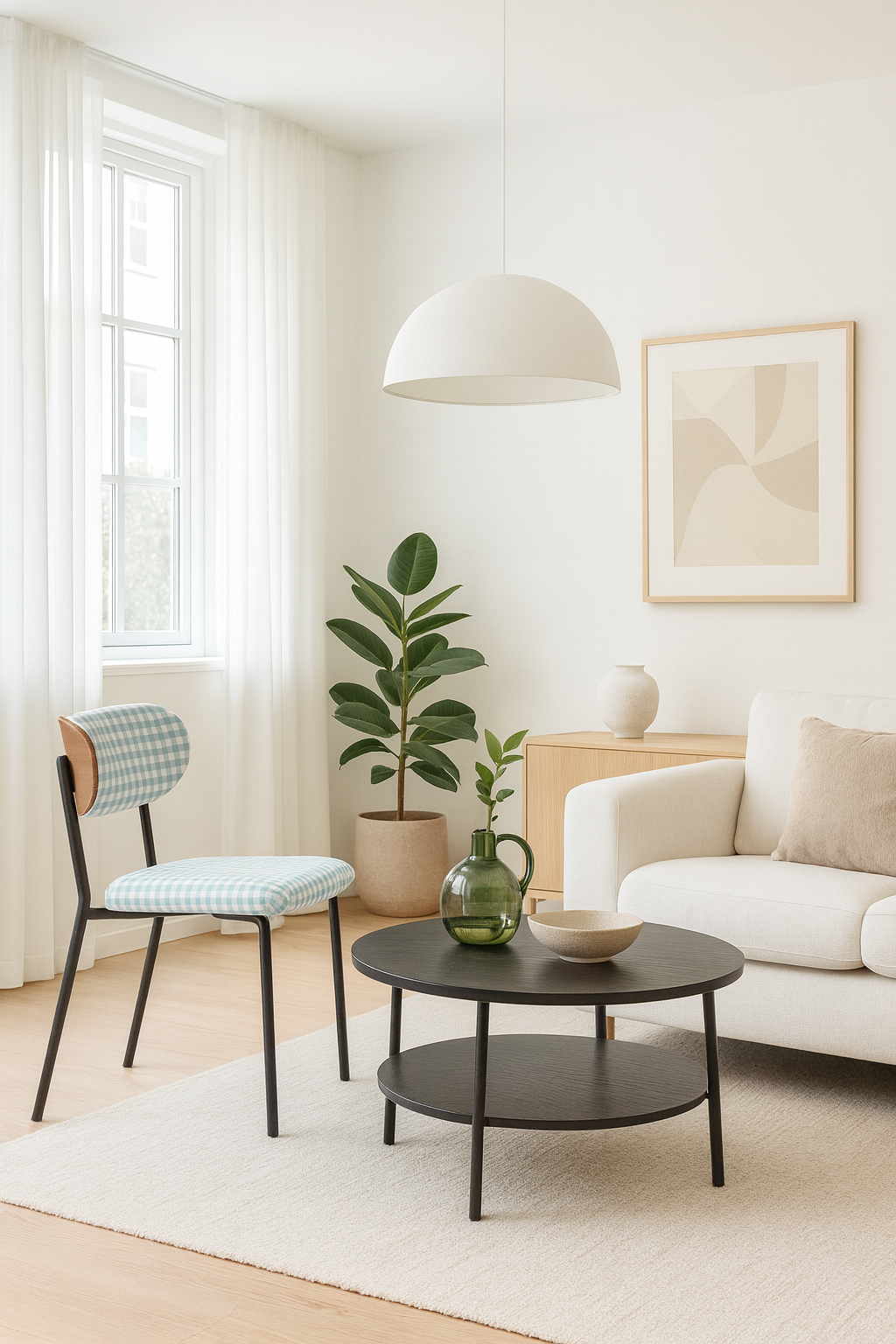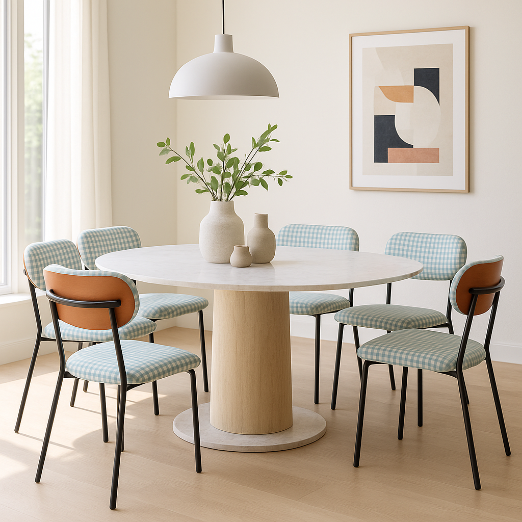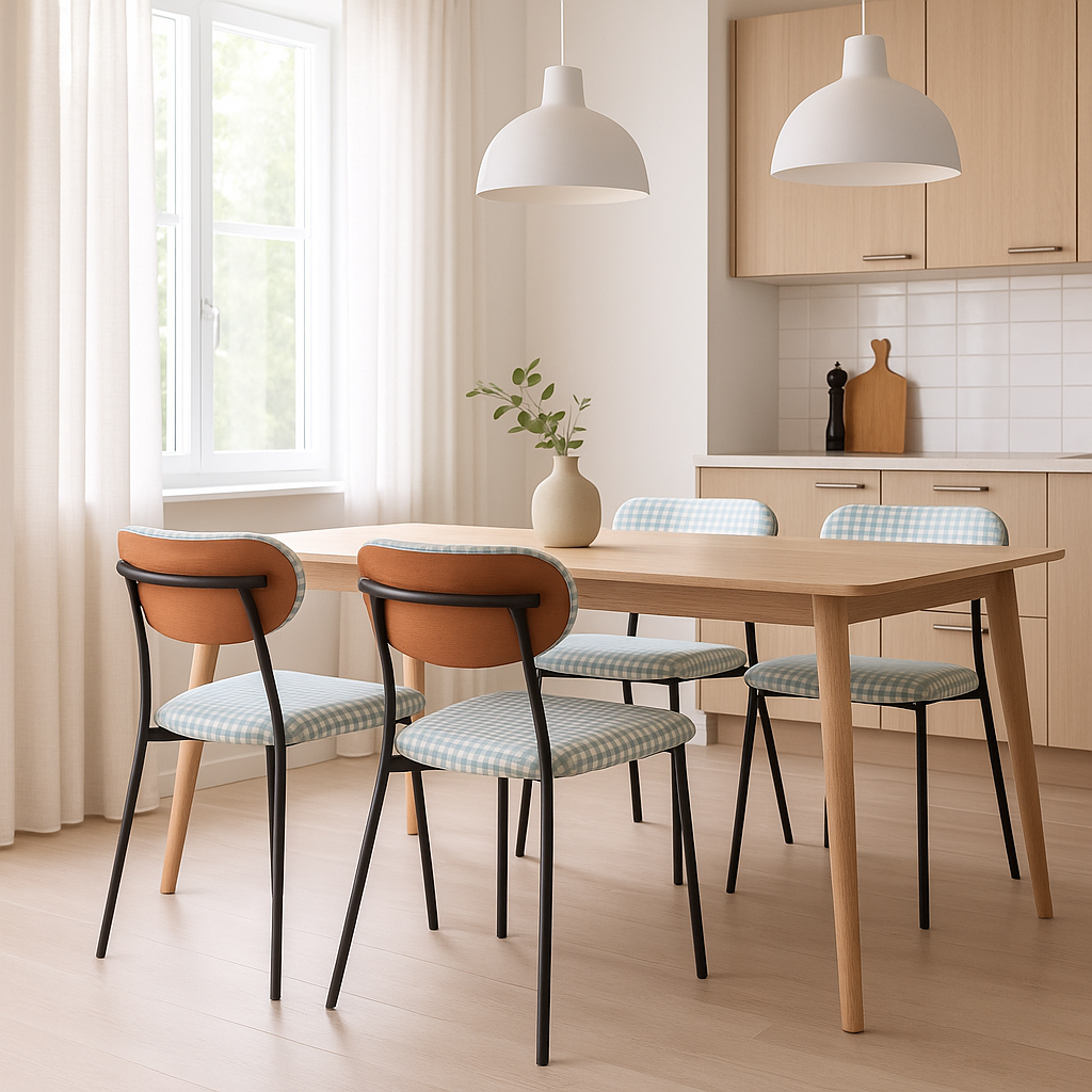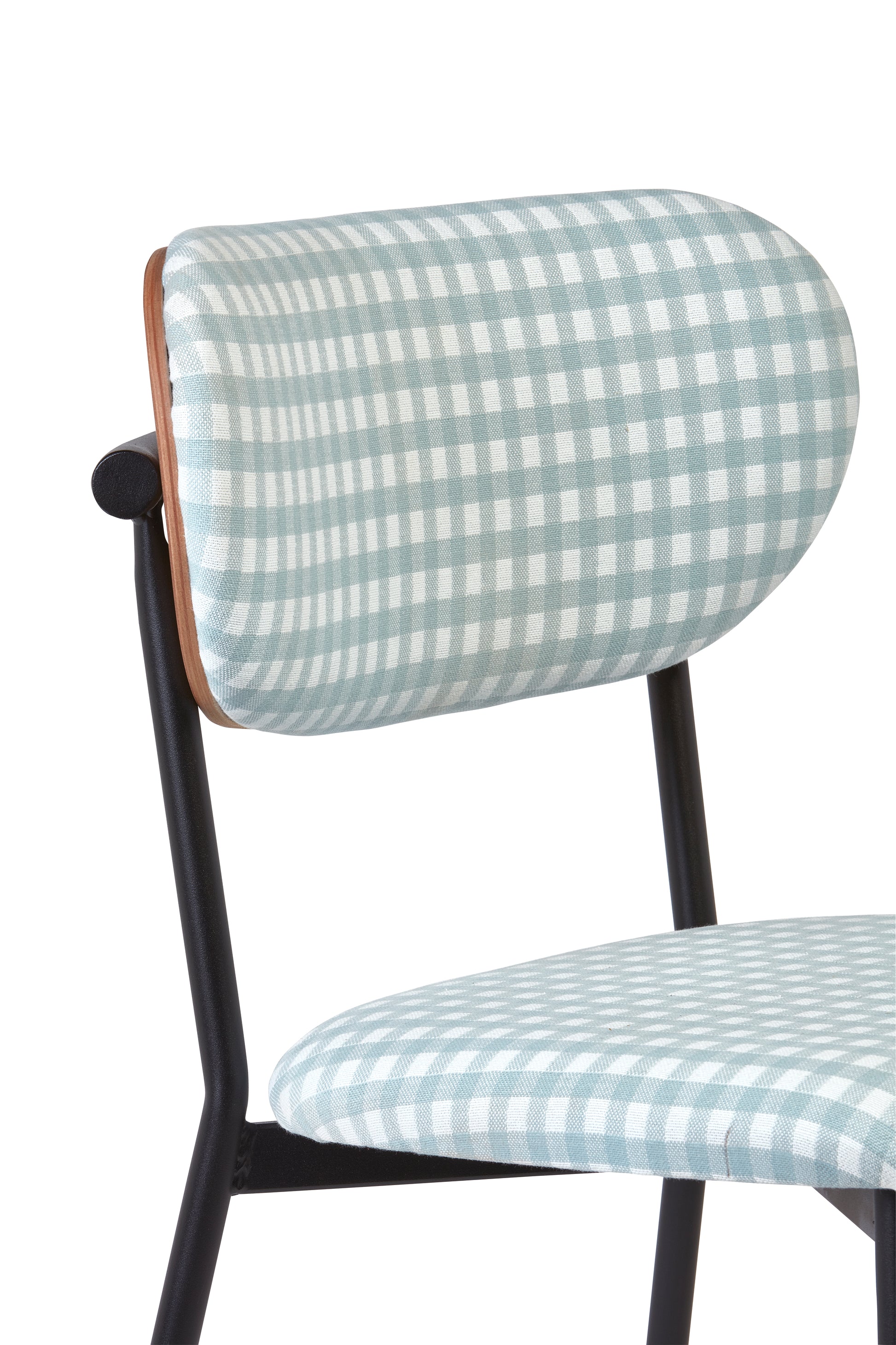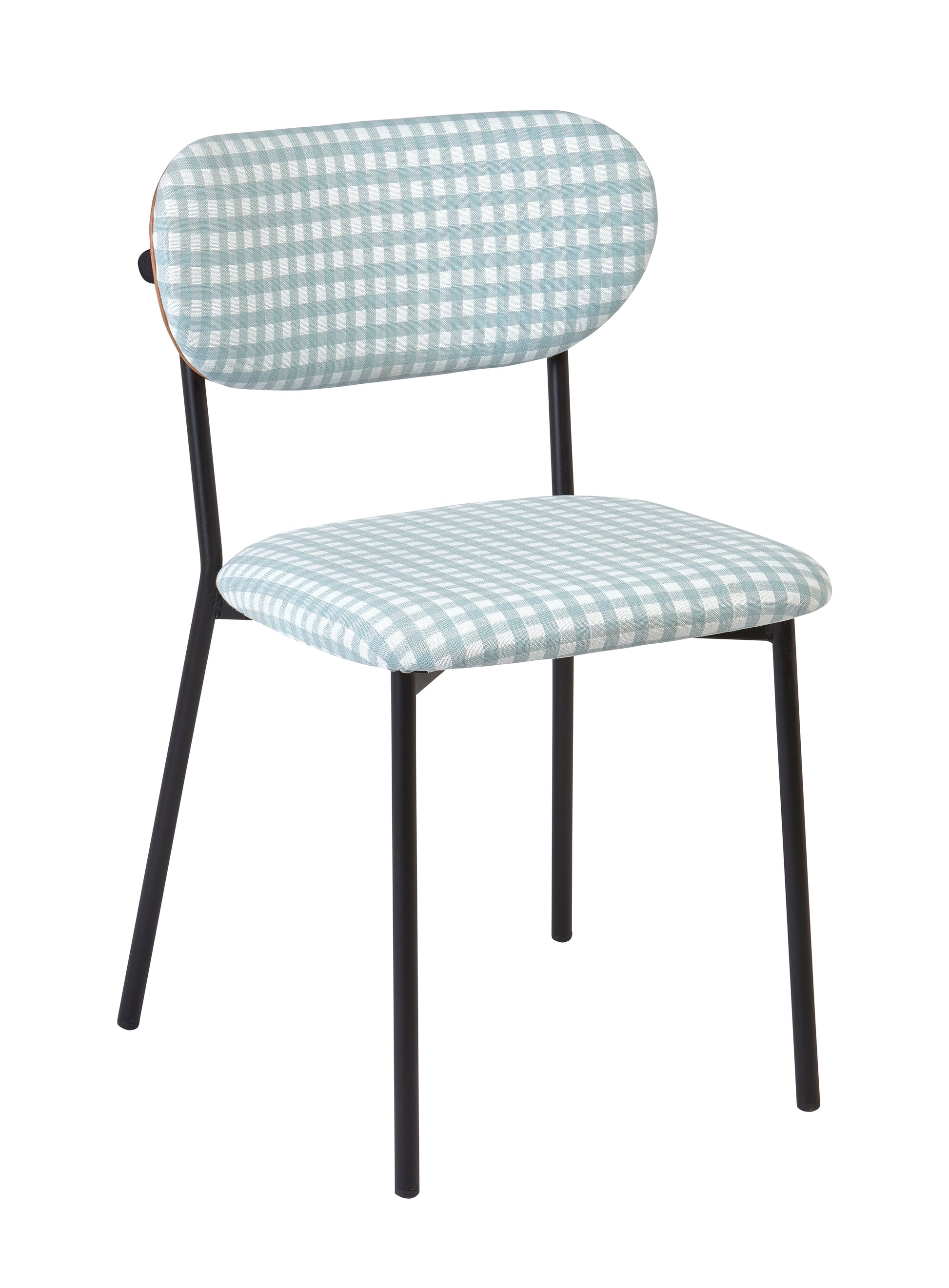 La Silla Amayra encarna la esencia de los espacios acogedores donde el tiempo se detiene. Su tapizado en cuadro vichy azul, beig o negro. El Vichy aporta ligereza y frescura, mientras que la estructura metálica en negro le da solidez y un aire contemporáneo. El respaldo en madera curvada añade una nota cálida y orgánica, equilibrando el conjunto con un guiño retro que nunca pasa de moda.