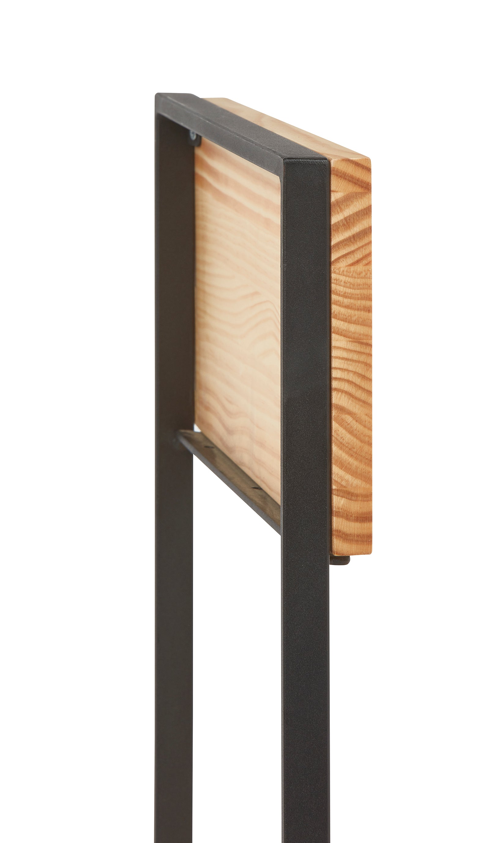 El taburete Lion combina fuerza y simplicidad en un diseño de inspiración industrial. Su estructura de acero negro le otorga un aire arquitectónico y robusto, mientras que el asiento y respaldo en madera aportan calidez y equilibrio visual.