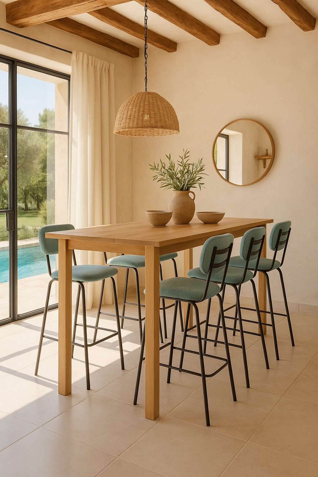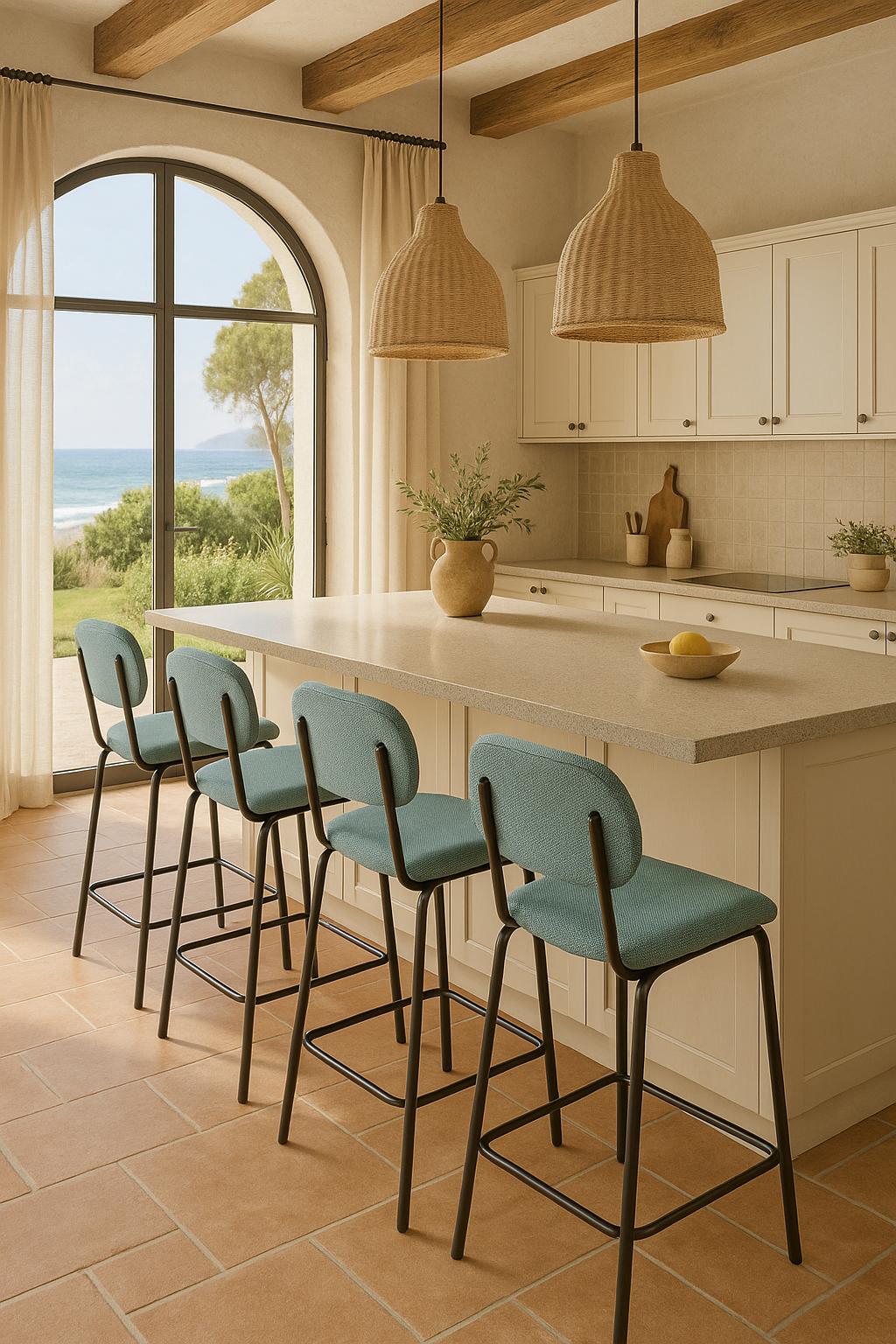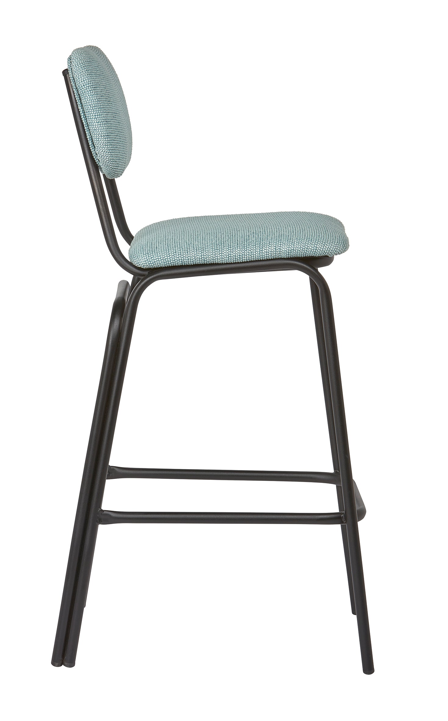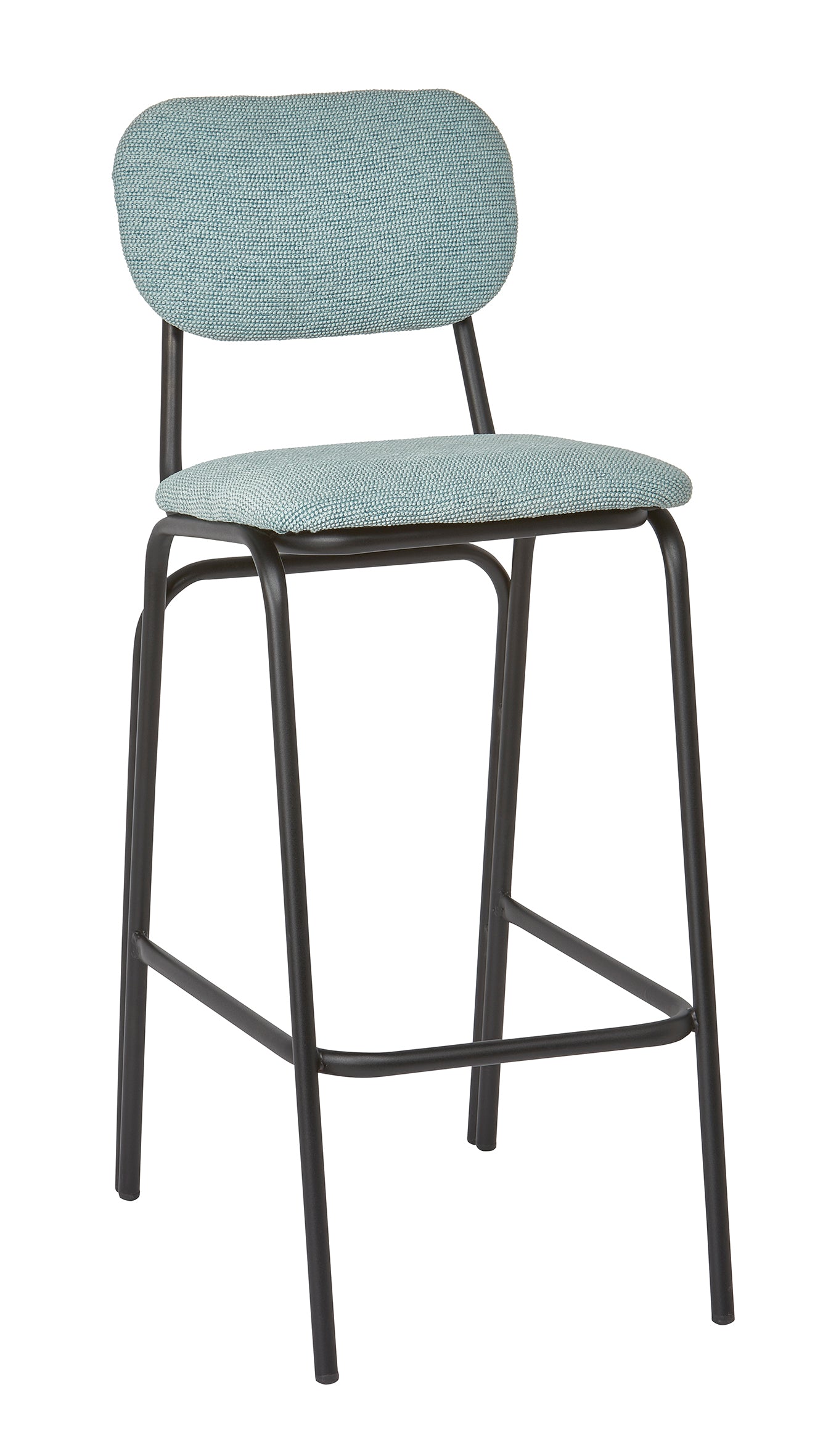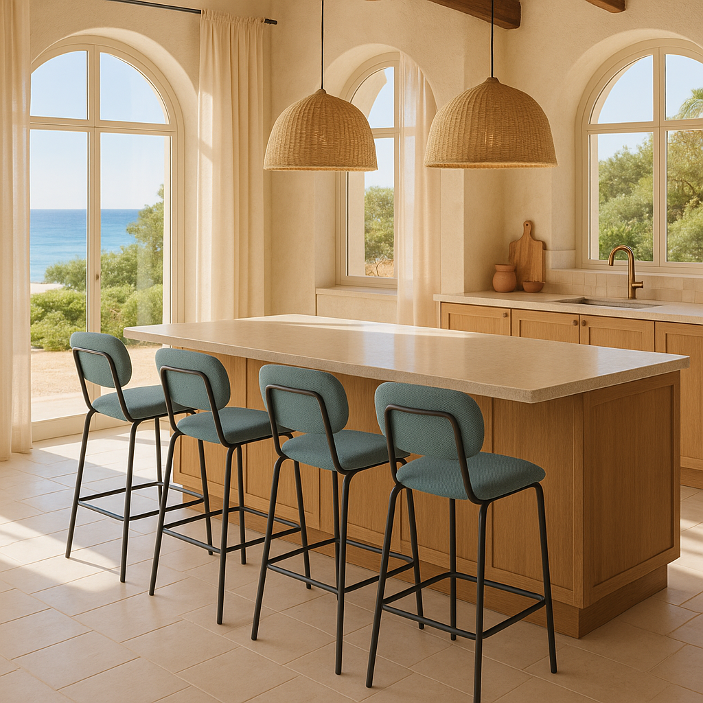 La sencillez puede ser cautivadora cuando se viste de detalles sutiles. El taburete Liria eleva la experiencia de sentarse en la cocina o el comedor con un aire fresco y urbano. Su respaldo redondeado y su asiento tapizado en un tono azul verdoso aportan una sensación de calma serena, como una brisa marina que se cuela en espacios modernos. La estructura metálica en negro mate dibuja líneas limpias y sólidas, equilibrando ligereza visual con una presencia robusta. Perfecto para acompañar barras y mesas altas, es una pieza pensada para durar y aportar estilo sin esfuerzo.