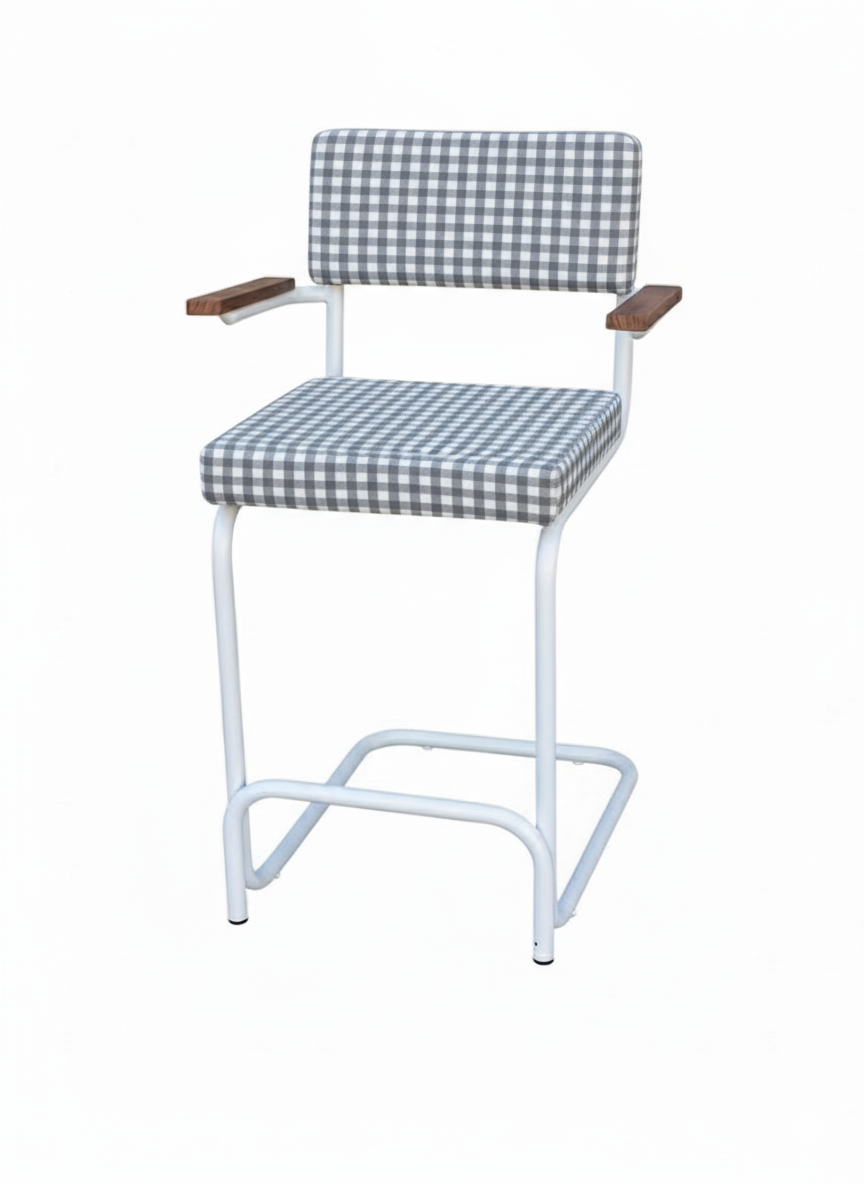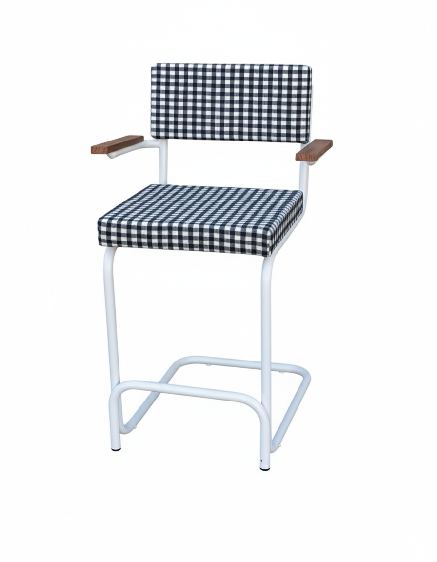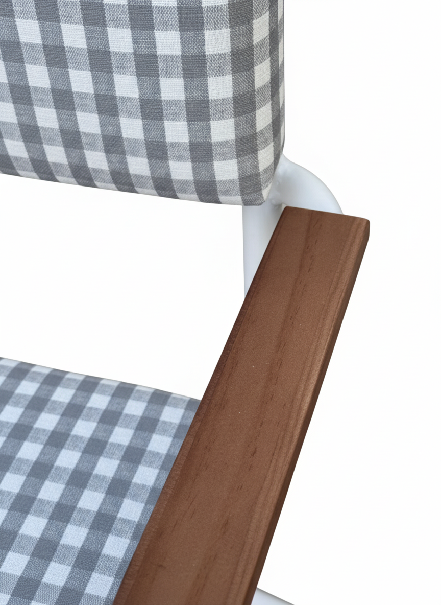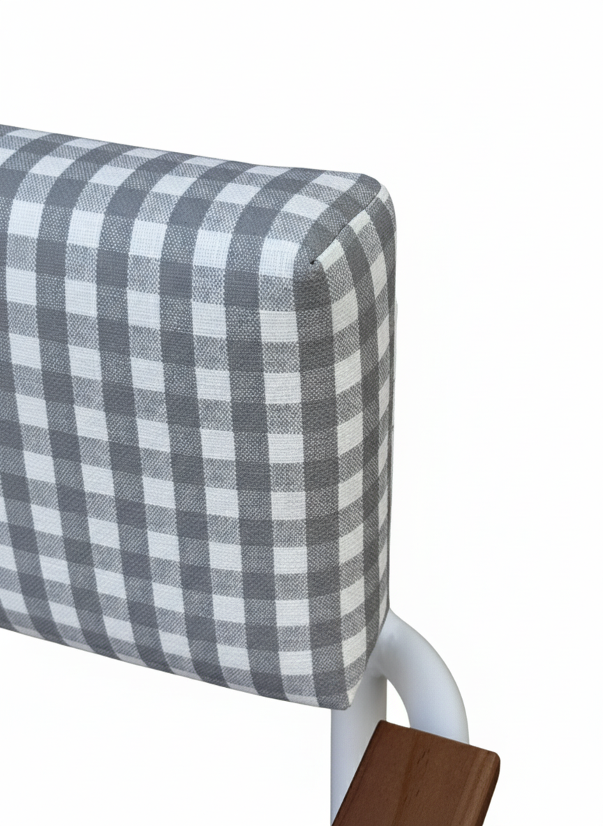 Asiento y respaldoTapizados en tela de cuadros vichy en blanco y negro, con espuma de alta densidad.